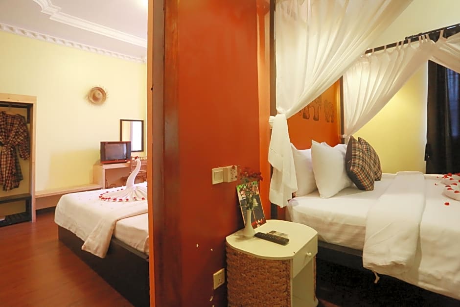 Air-conditioned room come with tiled or wooden flooring, a safety box, writing desk, wardrobe, seating area, small fridge, bathrobes and a TV are also included. The private bathroom offers shower facility, hairdryer and free toiletries. Benefits include: - Free bus station pick up by tuk tuk (Only in Siem Reap) - Free 2 bottles of water daily - Complimentary coffee and tea in the room - Complimentary welcome drink and cold towel upon arrival - Offer 20% off massage service - Offer happy hour buy 2 get 1 free at pool side - Daily clean room - Free Wifi - Free big Parking Space - Free Swimming Pool - Complementary 2 hour early check in or late check out ( Subject to room available ) - Complimentary honeymoon or birthday set up (please provide details in advance using the Special Requests box available)